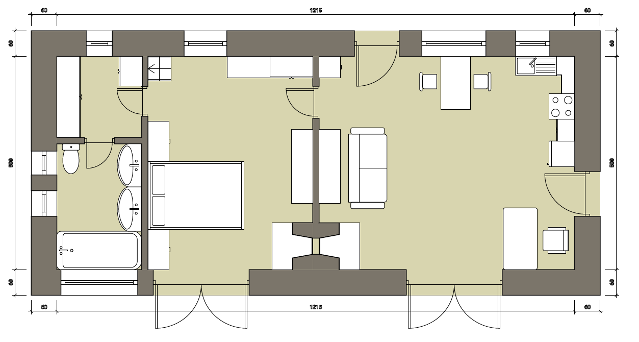 The main building contains the kitchen, dining area, living room, and one bedroom.
